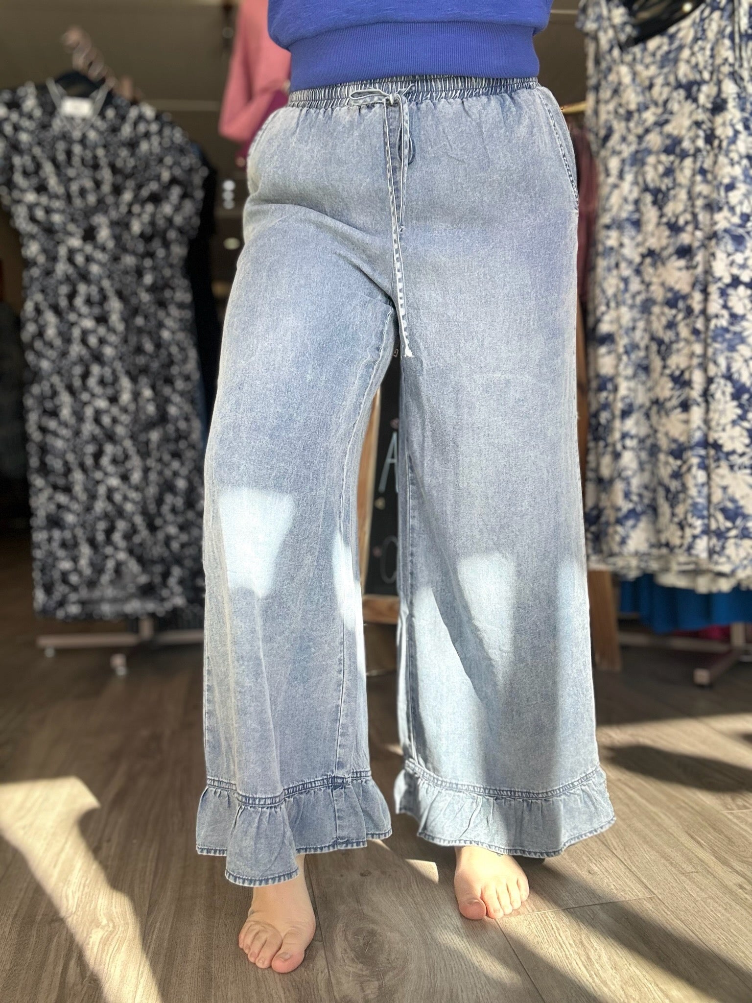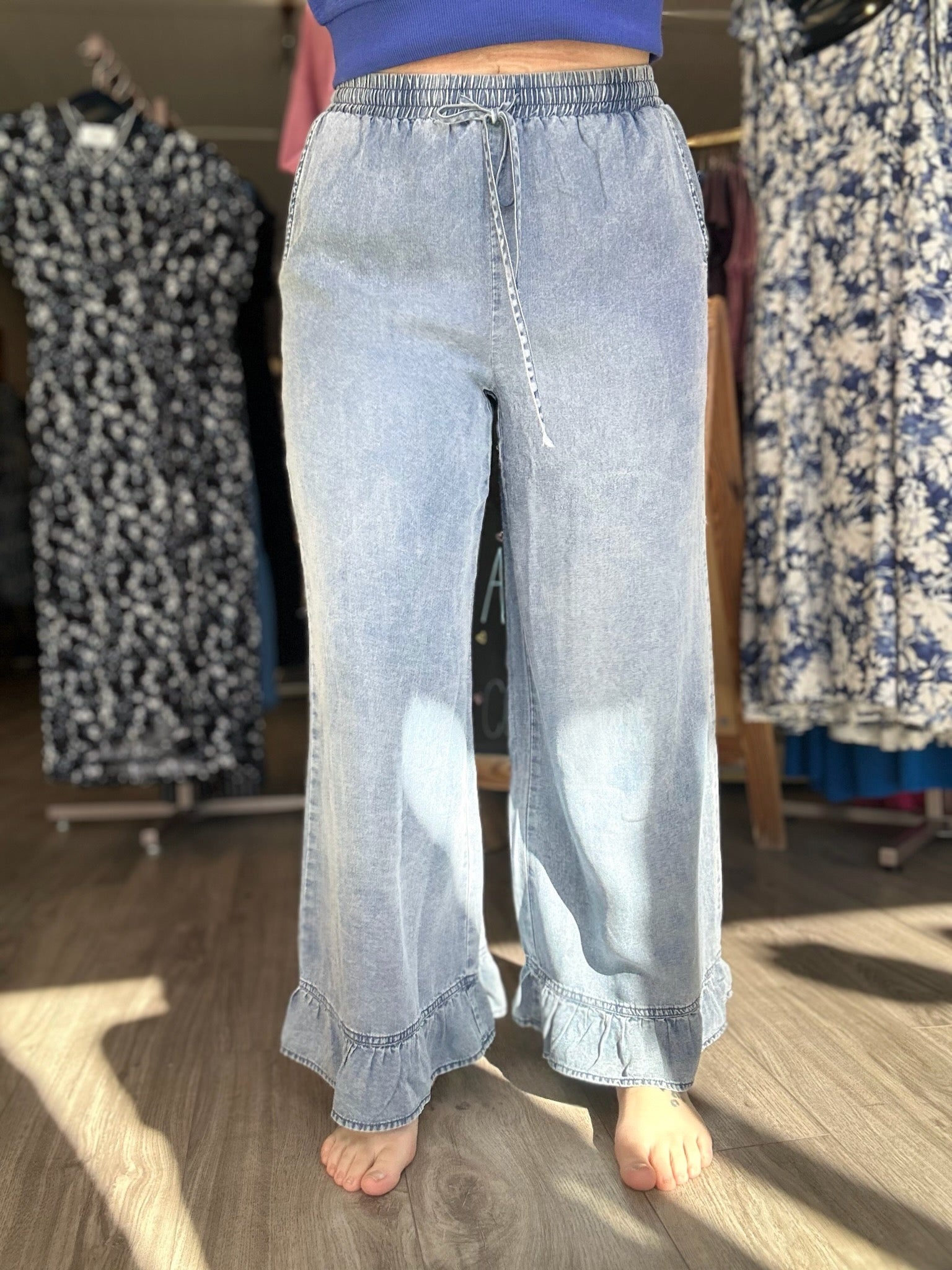 Drawstring and Elastic Waist Wide Leg Pocketed Ruffled Bottom Hem Pants in Denim Blue
