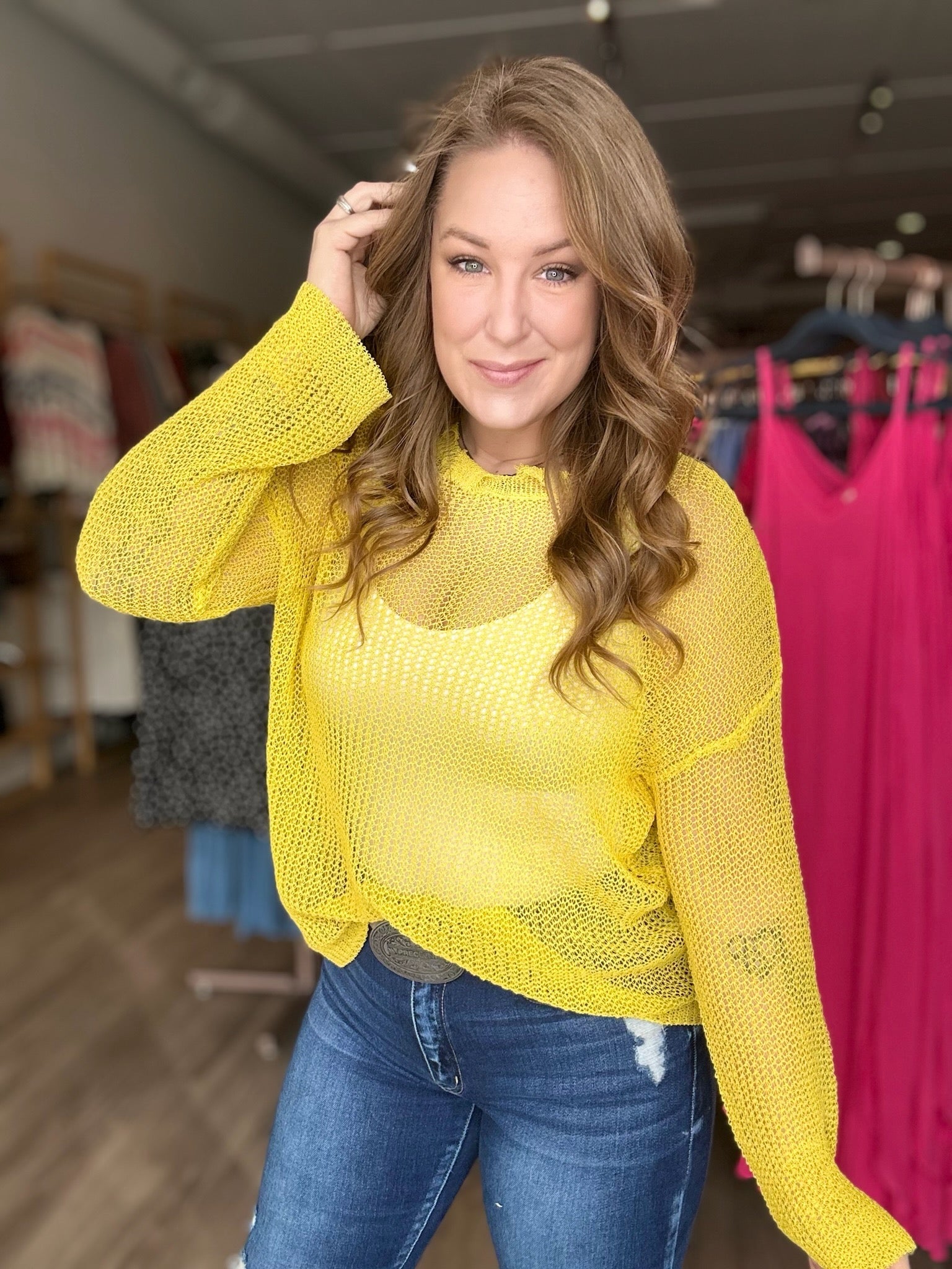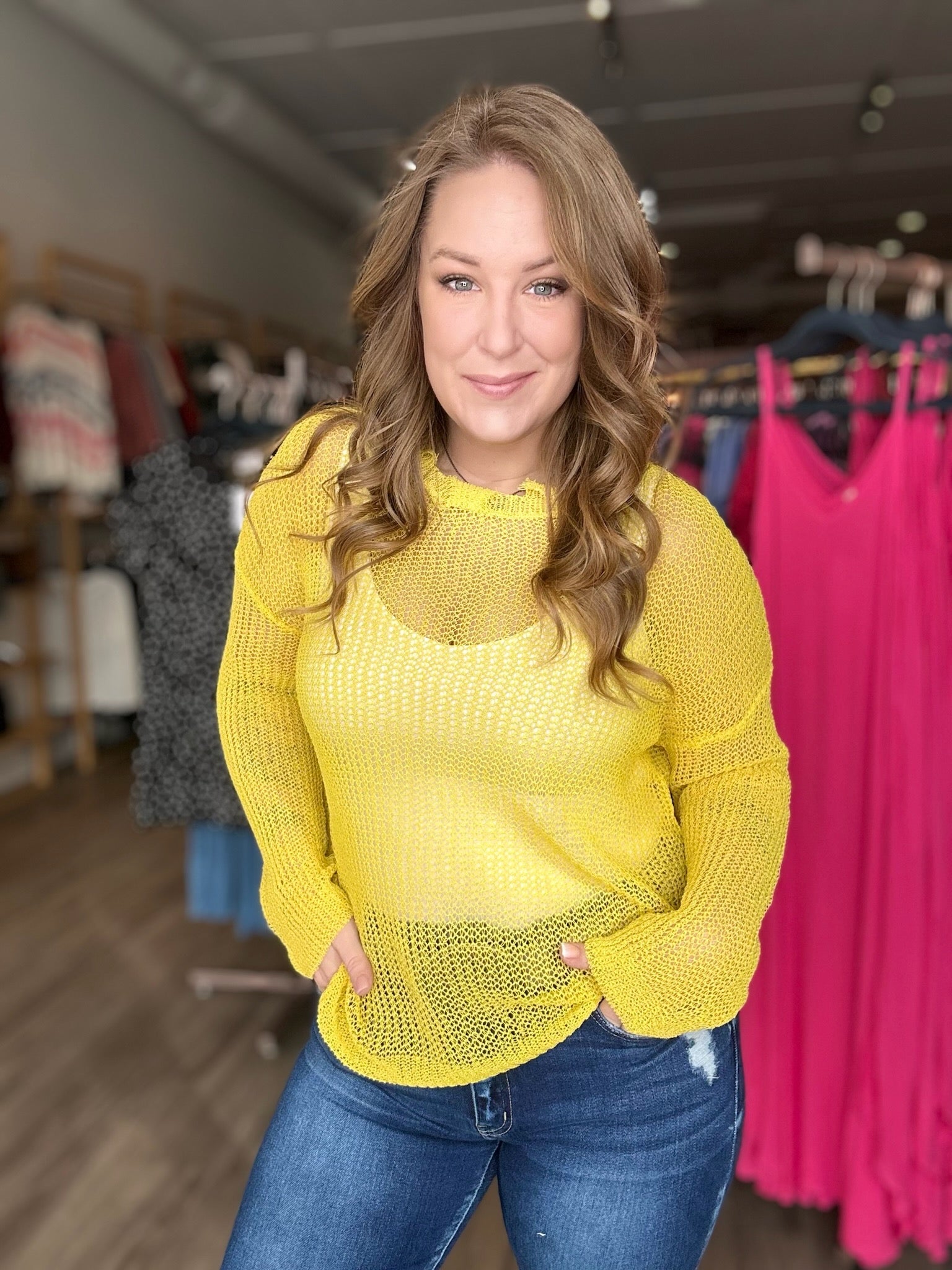 • Yellow Distressed Hem Netted Mesh Long Sleeve Sweater