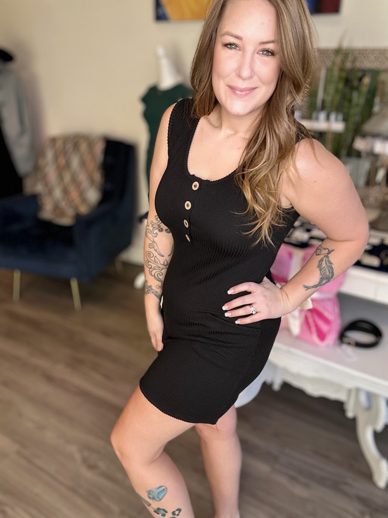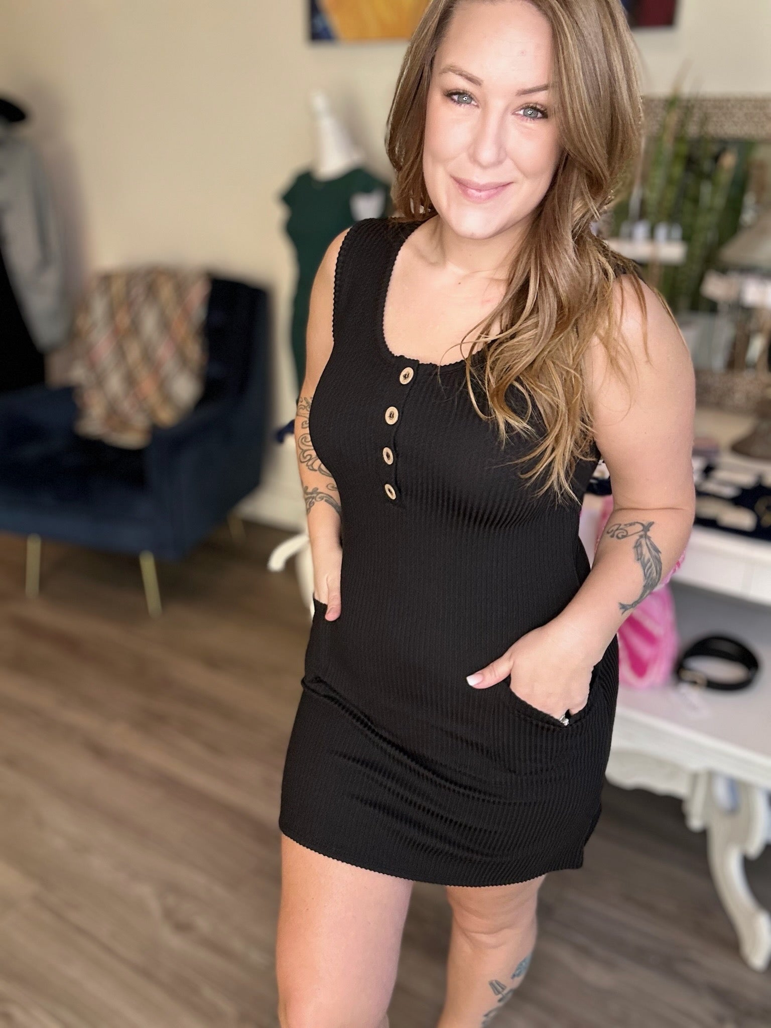 Corded Rib Sleeveless Tank Mini Dress with Front Pockets