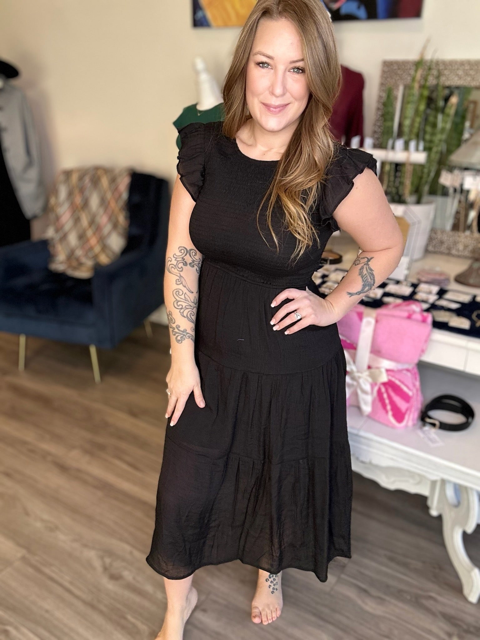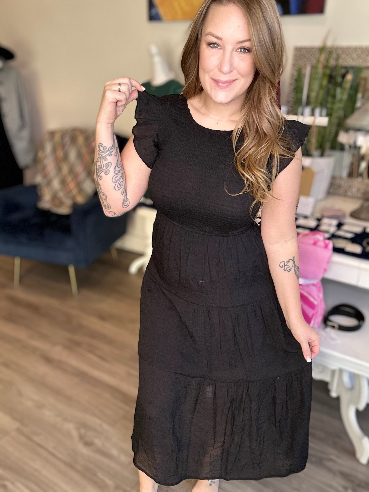 Black Smocked Ruffle Sleeve Dress