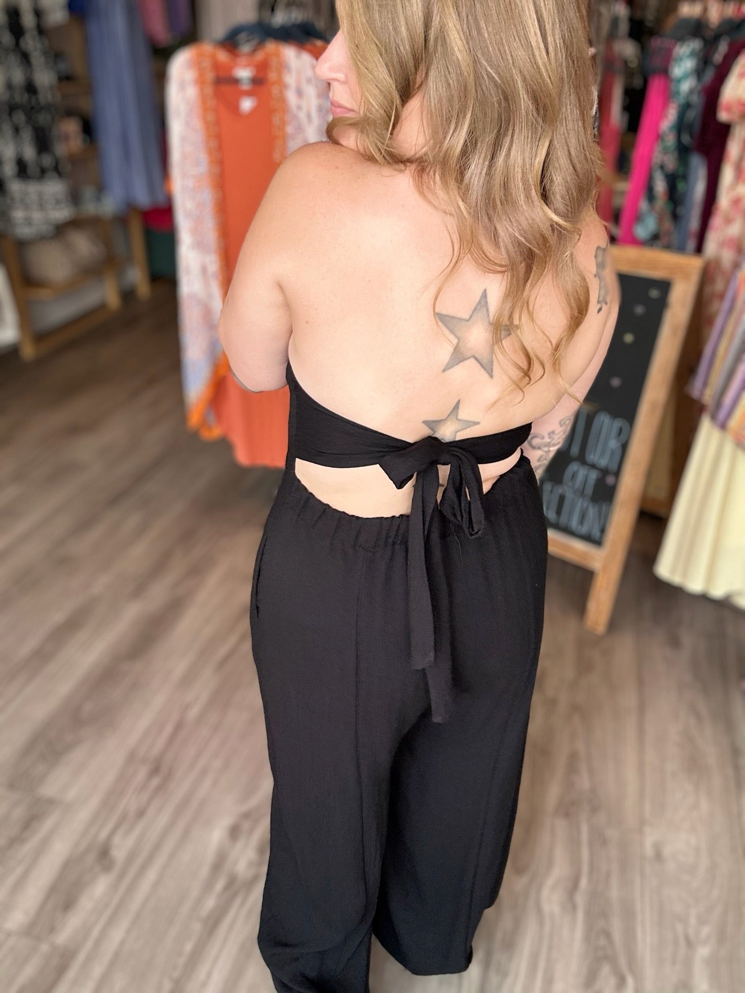 Women's Black Halter Button Front Tie Back Fitted Wide Leg Jumpsuit