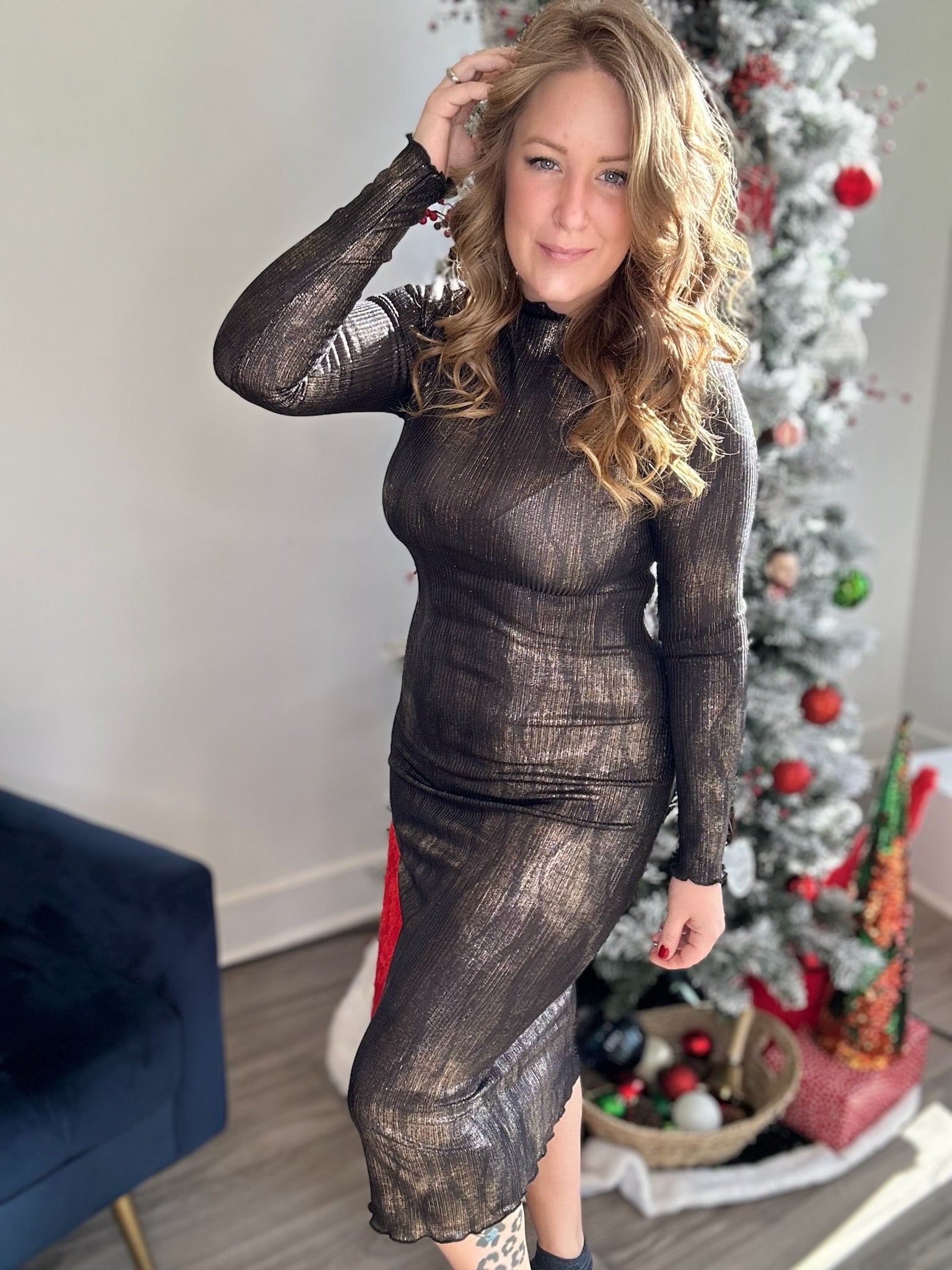 • Women's Black Mock Neck Lettuce Hem Printed Long Sleeve Midi Dress