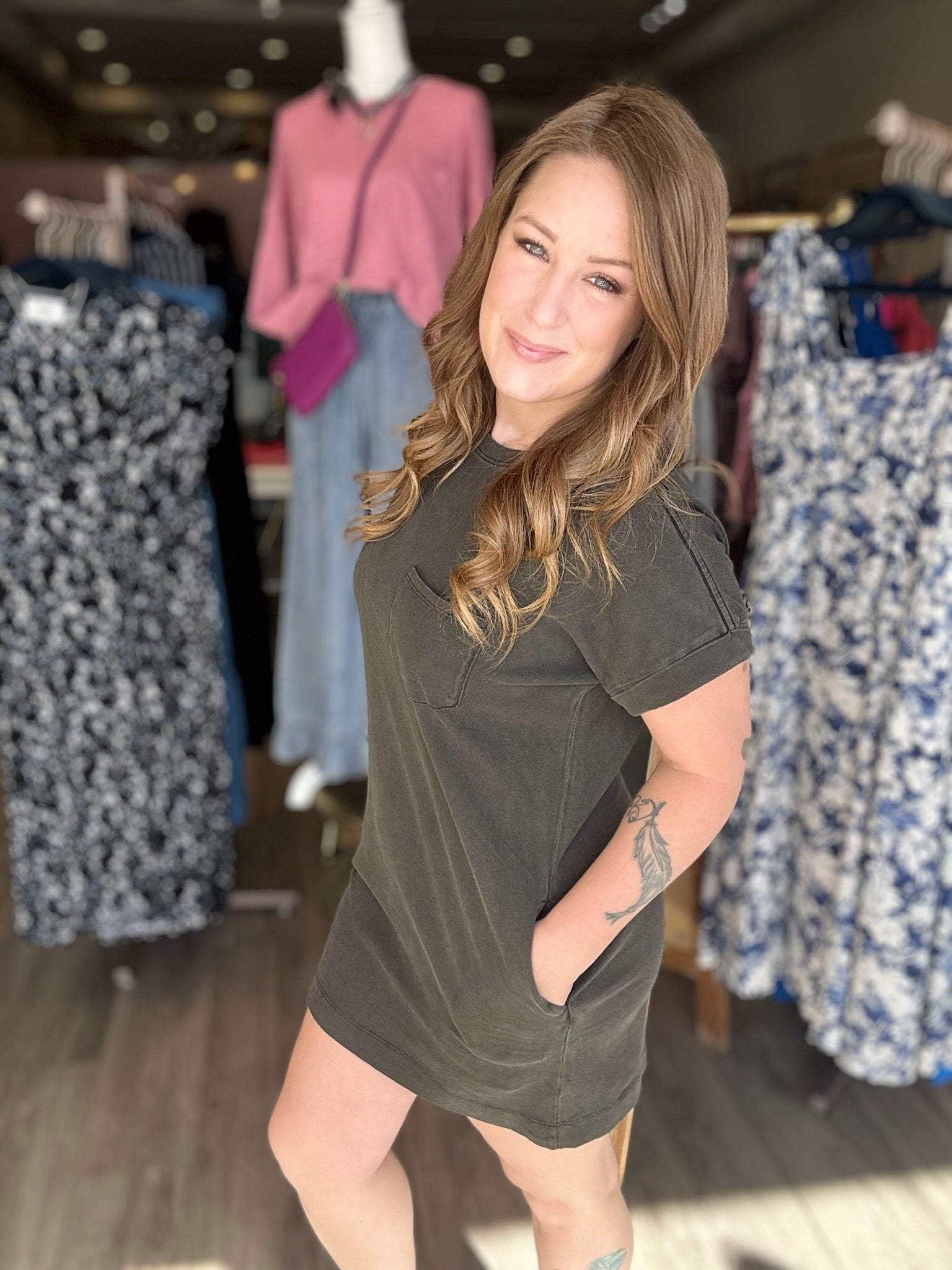 • Charcoal Black Round Neck Pocketed Shirt Mini Dress