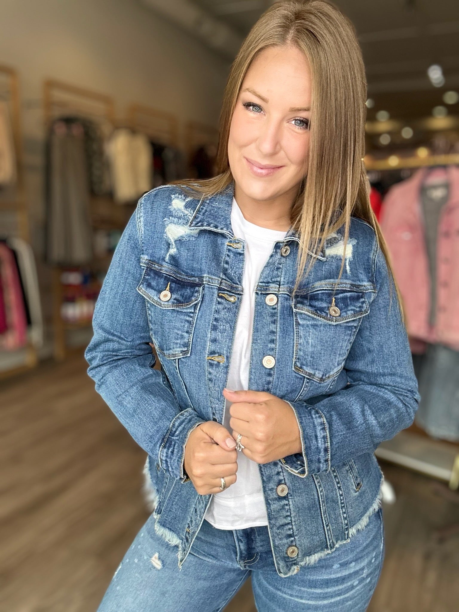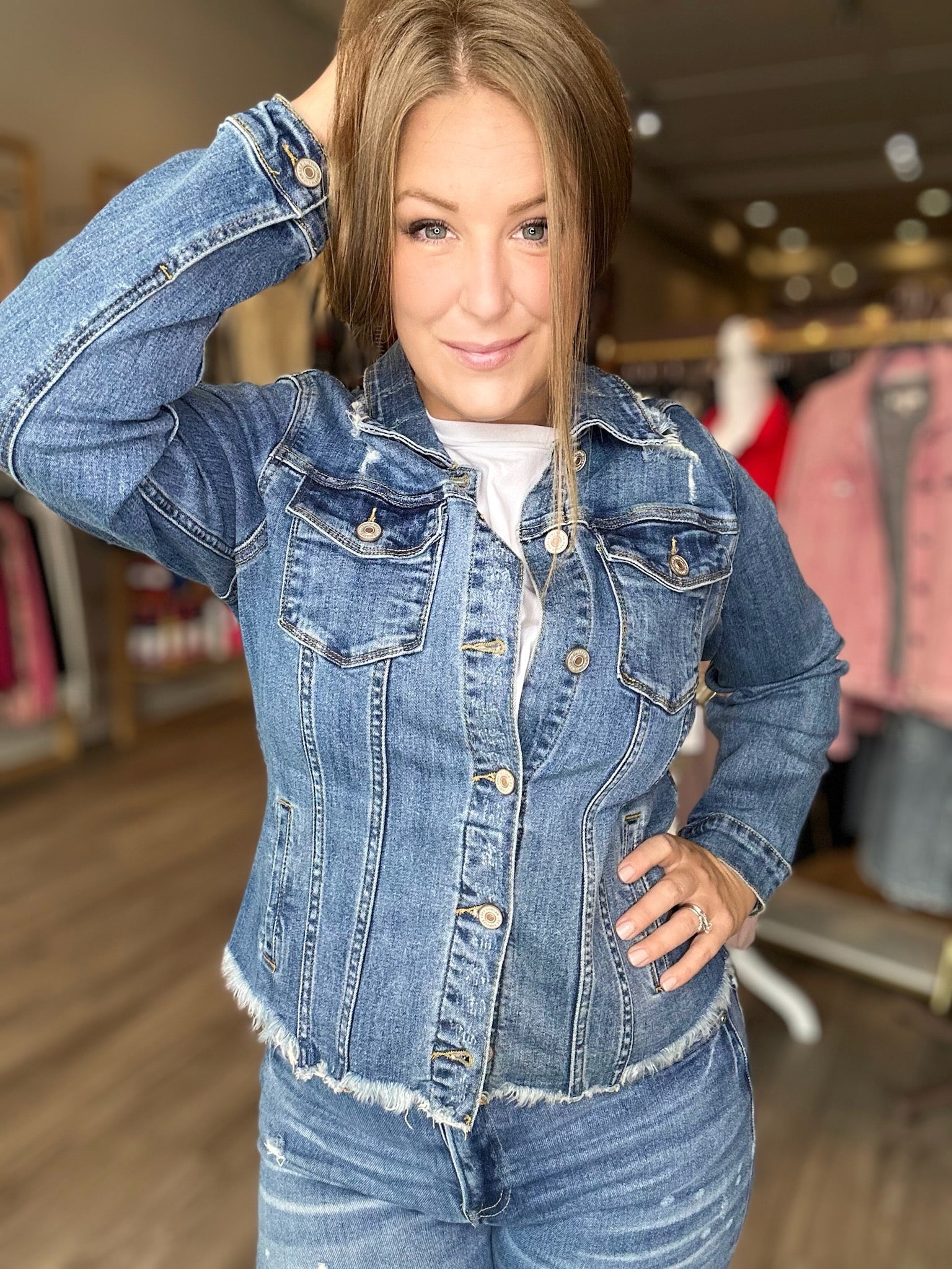 • Blue Denim Button Fly Collared Long Sleeve Frayed Distressed Jacket