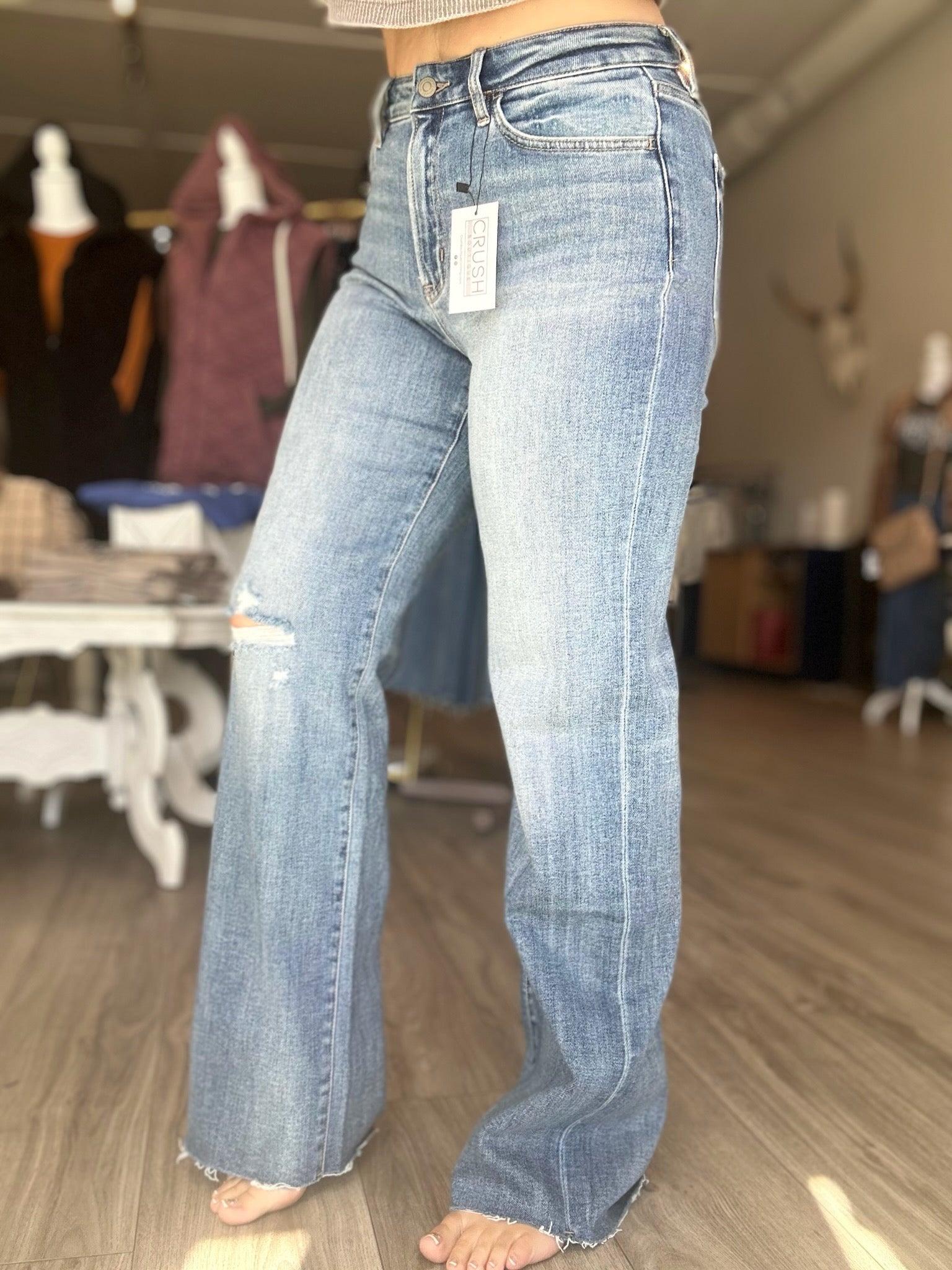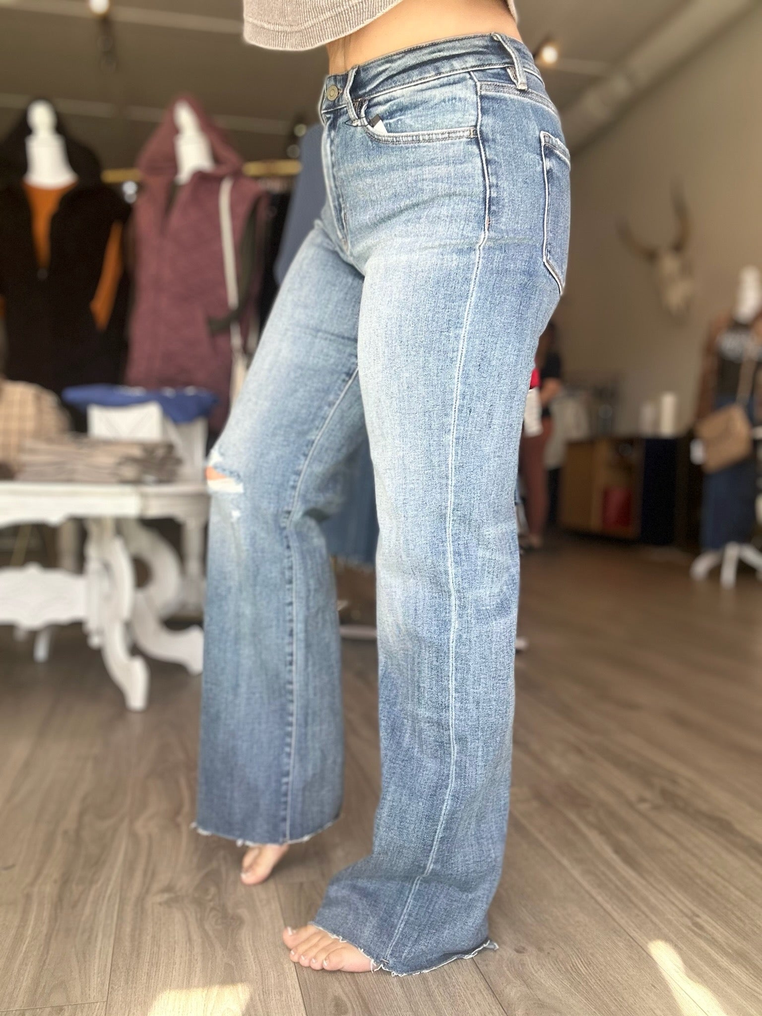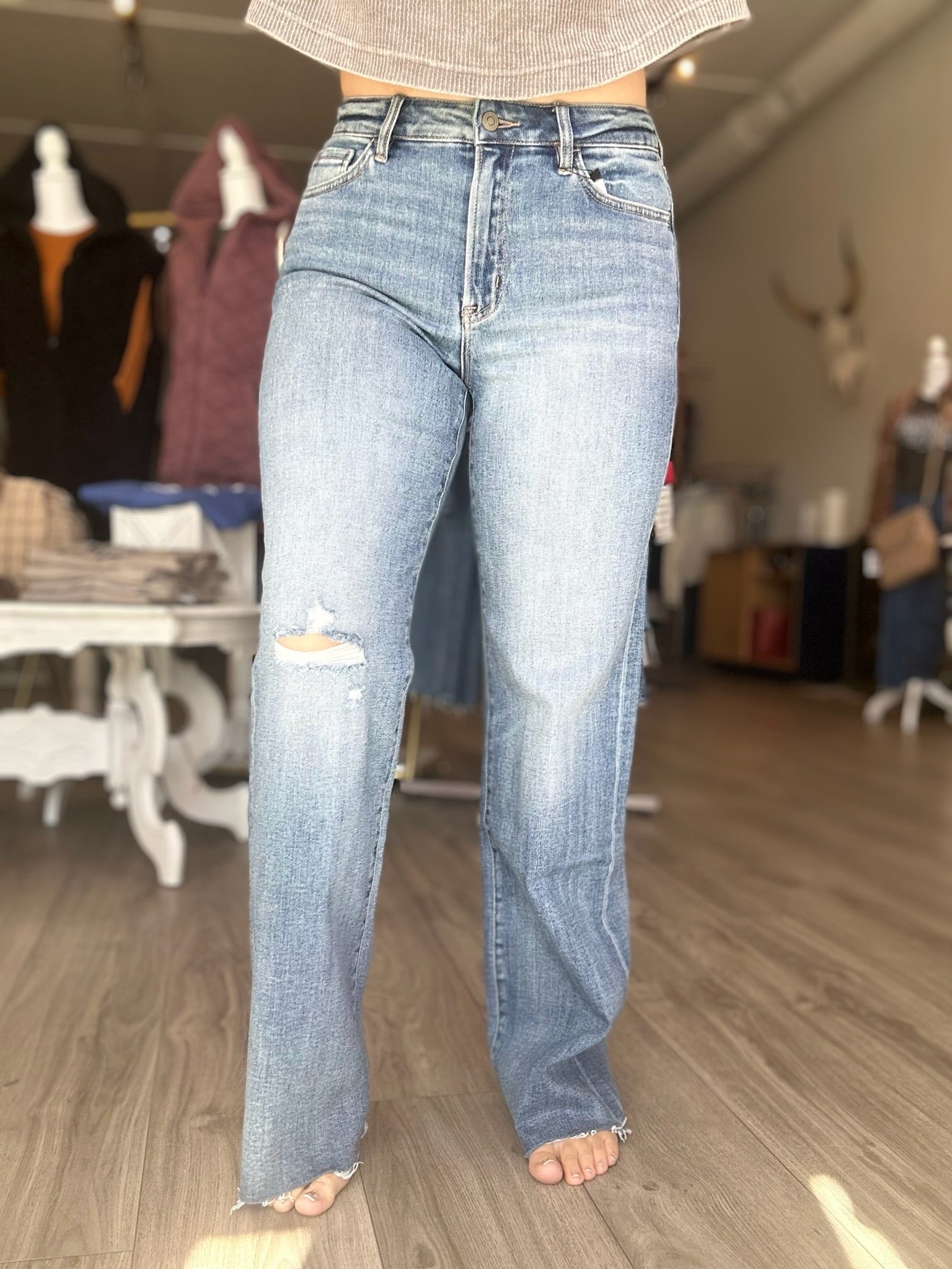 Women's High Rise Frayed Hem Distressed Wide Jeans