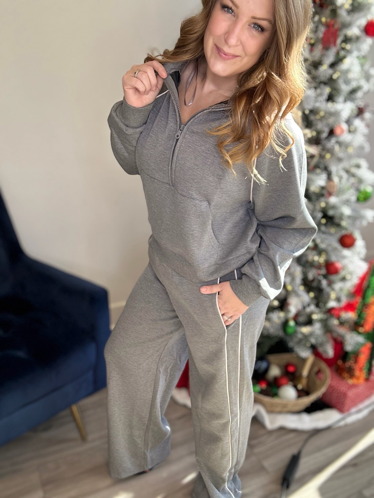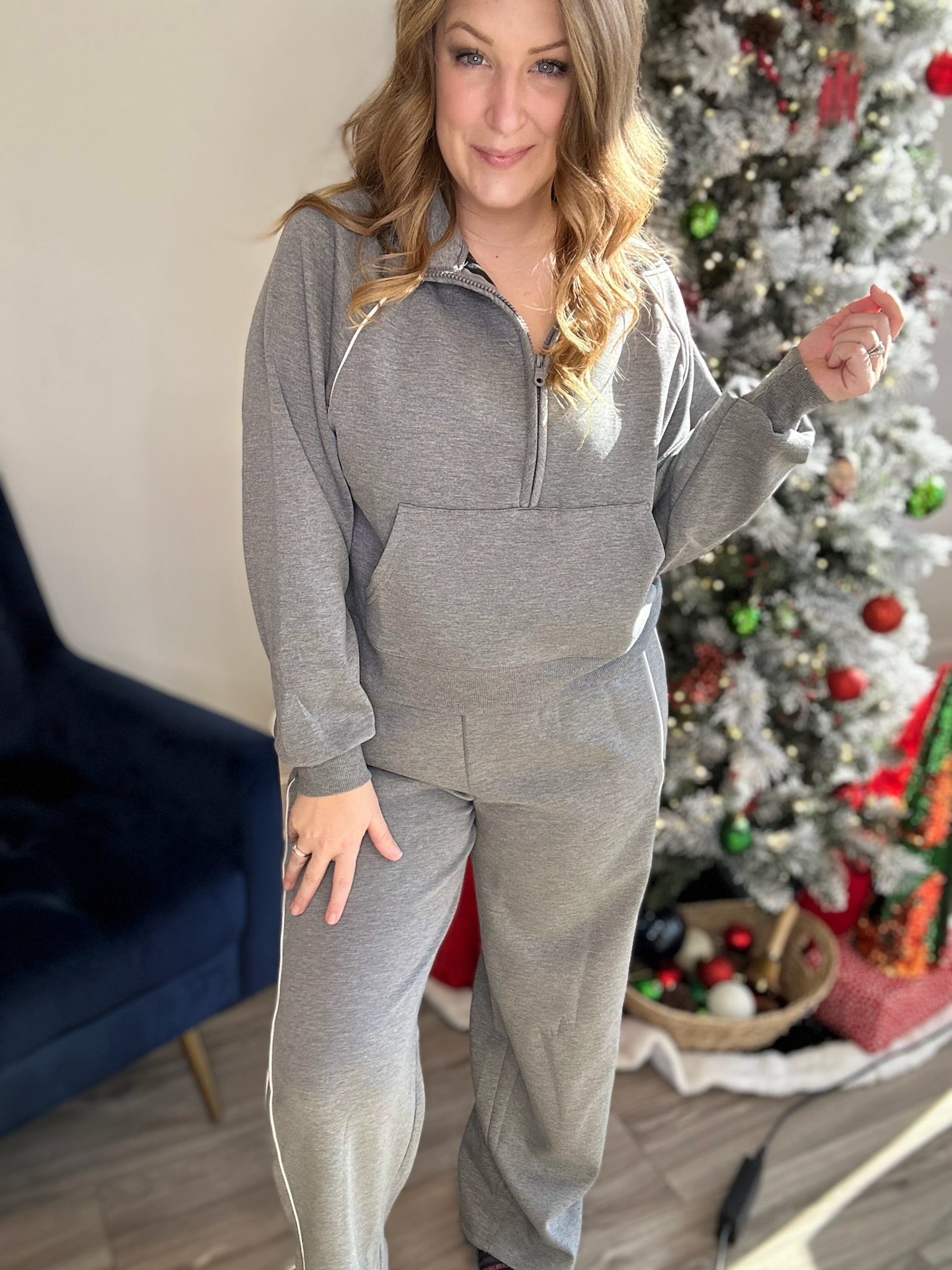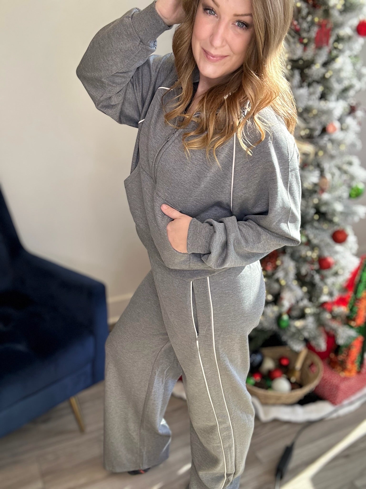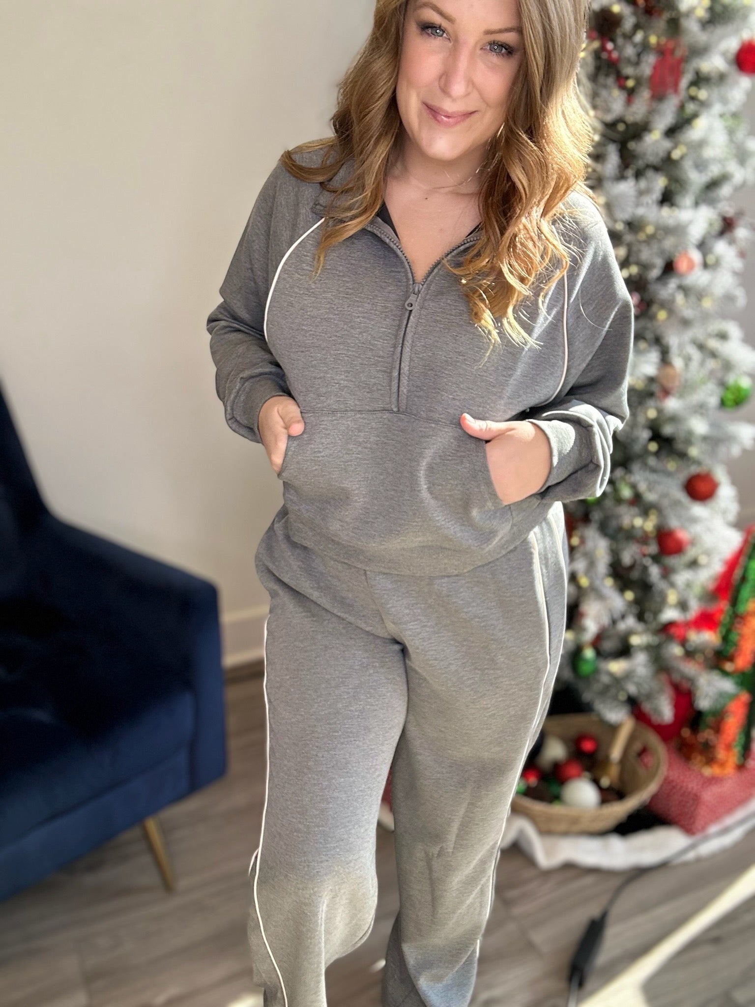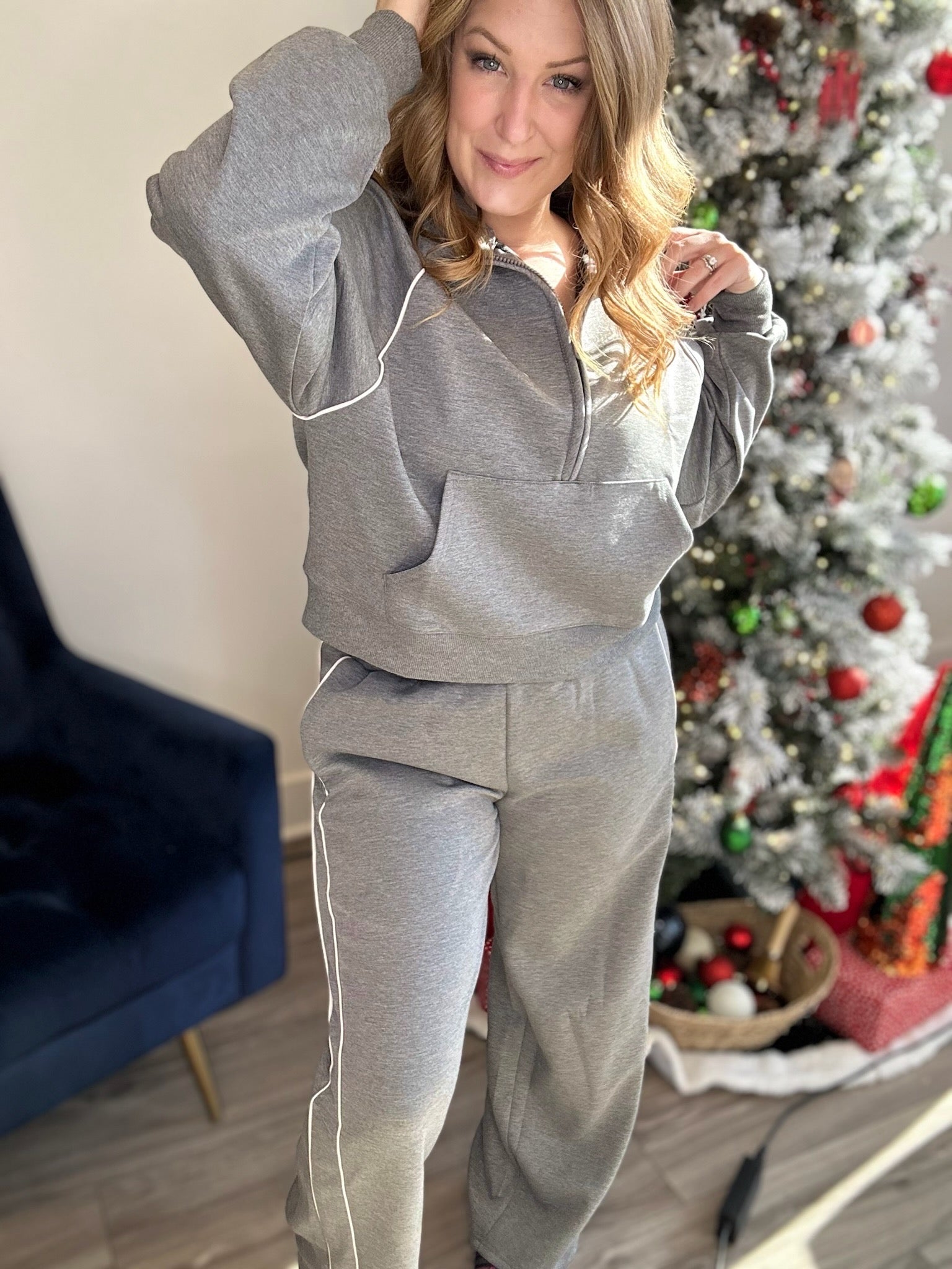 • Women's Heather Grey Piping Detail Knit Casual Sweater Top with a Kangaroo Pocket